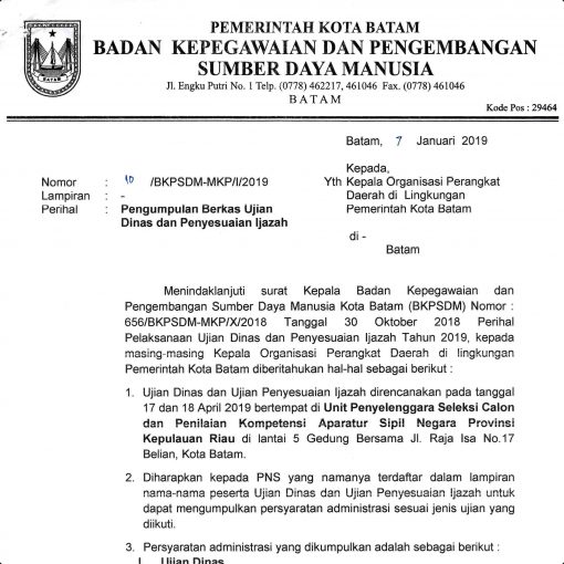 Menindaklanjuti surat Kepala Badan Kepegawaian dan Pengembangan Sumber Daya Manusia Kota Batam (BKPSDM) Nomor : 656/BKPSDM-MKP/X/2018 Tanggal 30 Oktober 2018 Perihal Pelaksanaan […]