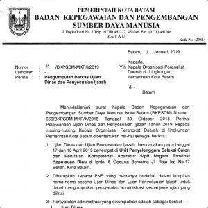 Menindaklanjuti surat Kepala Badan Kepegawaian dan Pengembangan Sumber Daya Manusia Kota Batam (BKPSDM) Nomor : 656/BKPSDM-MKP/X/2018 Tanggal 30 Oktober 2018 Perihal Pelaksanaan Ujian Dinas dan Penyesuaian ljazah Tahun 2019, kepada masing-masing Kepala Organisasi Perangkat Daerah di lingkungan Pemerintah Kota Batam diberitahukan bahwa: