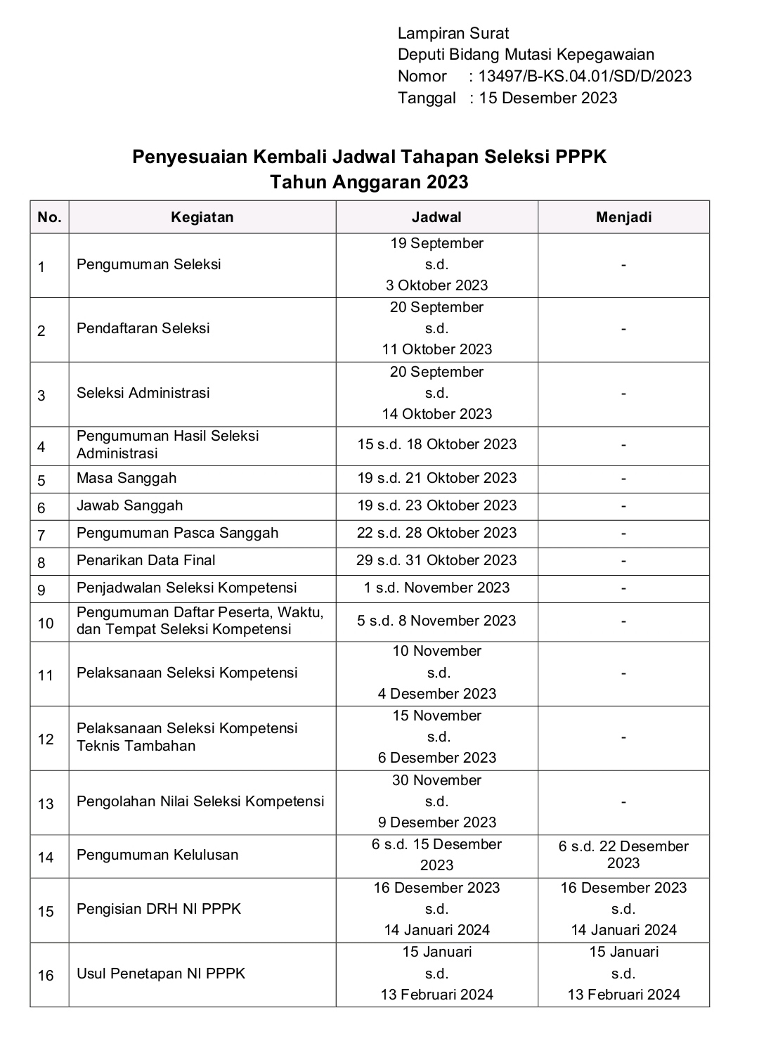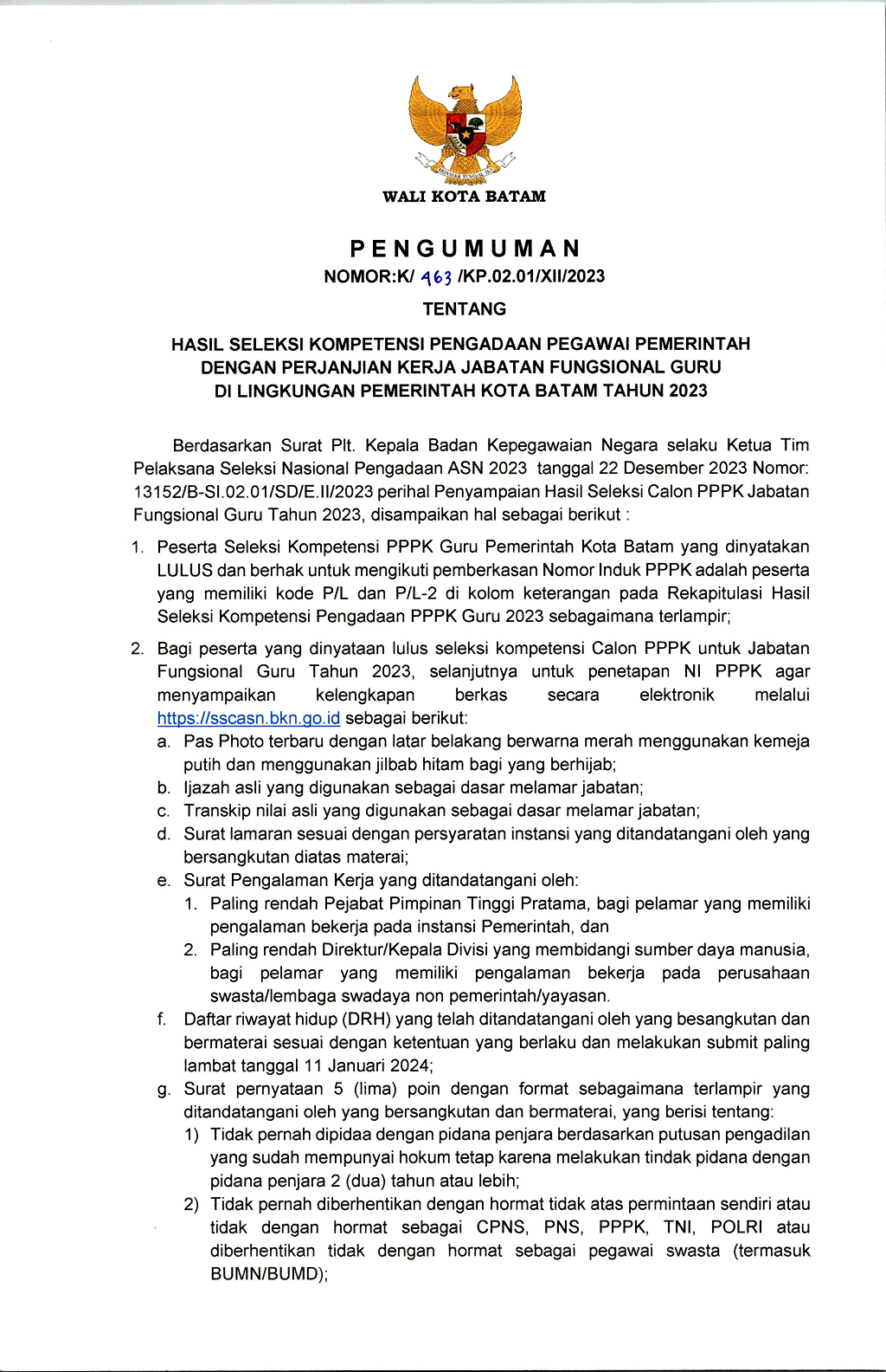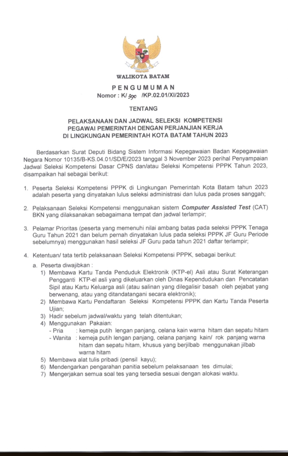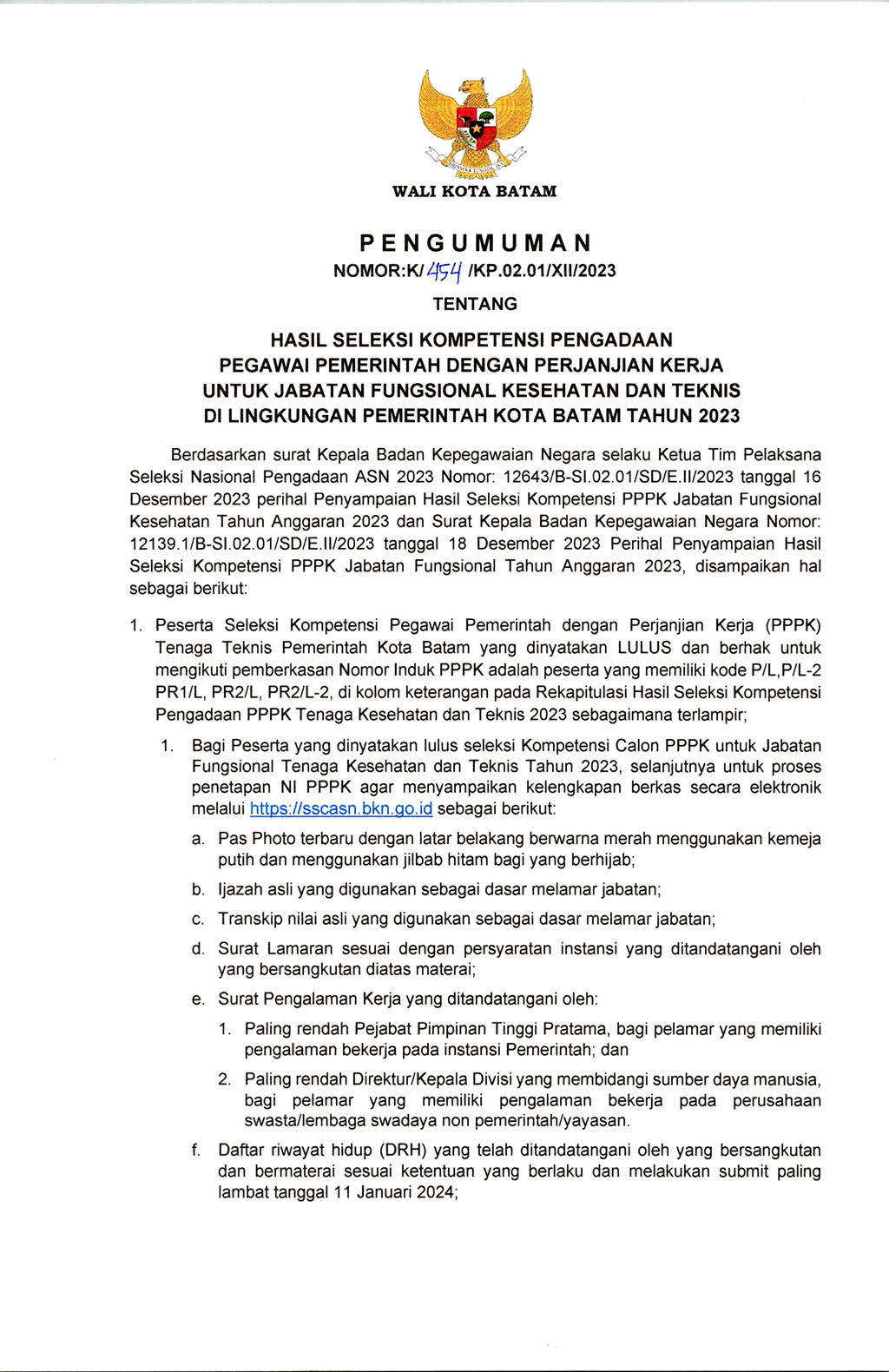 dari jumlah pelamar sebanyak 6.189 orang yang lulus seleksi administrasi sebanyak 2166 orang dan berhak mengikuti uji seleksi kompetensi. kemudian jumlah peserta yang mendapatkan formasi sebanyak 689 orang yang terdiri dari: 288 orang PPPK Tenaga Teknis, 158 orang PPPK Tenaga Kesehatan dan 143 orang PPPK Tenaga Guru. Pada saat proses pemberkasan dan penetapan NI PPPK, peserta mengundurkan diri sebanyak 4 orang, 1 orang masih menunggu validasi BKN dan 1 orang tidak memenuhi syarat dalam pemberkasan NI PPPK. formasi penempatan tersebar di 43 Perangkat Daerah di Lingkungan Pemerintah Kota Batam.